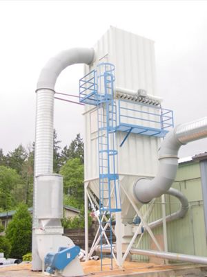 and The system designed by AIR-TEK NW used a single 60 hp high efficiency airfoil type blower on the clean air side of a modern pulse jet baghouse to provide 16,000 cfm. The fan blowing up to the cyclone by the main blower. The model FTP-144-10 pulse jet baghouse, airlocks, high efficiency